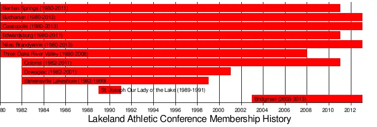 The Lakeland Athletic Conference was a high school athletic conference created in 1980 and disbanded in 2014. Founding members were Buchanan Bucks, Berrien Springs Shamrocks, Brandywine Bobcats, Cassopolis Rangers, Edwardsburg Eddies, and River Valley Mustangs. Later, Dowagiac, Lakeshore, Lake Michigan Catholic were added before they all later departed.