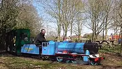A dual gauge 10+14 in (260 mm) / 7+14 in (184 mm) light railway was established in the park in 1992, originally as a temporary layout.[3] A more permanent track was laid down in 1993, as the railway company was granted a three-year lease.[3] Five years later, a longer lease was negotiated and construction began on the two stations, Eastleigh Parkway and Monks Brook.[3] They were opened in 1999, although further work on the layout itself was carried out in 2000.[3] A tunnel was added in 2003, and Eastleigh Parkway station was extended in 2005 with the addition of a café and shop.[3]