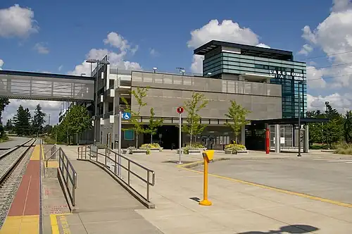 Lakewood station is a commuter rail station in Lakewood, Washington, United States. It is the terminus of the S Line of the Sounder commuter rail network, operated by Sound Transit in the Seattle metropolitan area. The station, located along Pacific Highway Southwest, includes a 620-stall parking garage and several bus bays served by Intercity Transit and Sound Transit Express. Lakewood station was originally scheduled to open in 2002 as part of a Sounder extension, but plans were delayed due to funding issues and the state government's work on the Point Defiance Bypass project. Construction on the $33 million station and garage began in March 2007 and it opened for use by buses on September 18, 2008. Sounder service to Lakewood began in October 2012 and the pedestrian bridge opened a few months later.