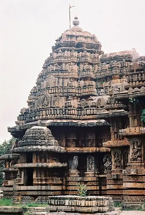The three shrines are connected by a common hall (mantapa). The lateral shrines are connected directly to the hall while the middle shrine has a vestibule that connects the sanctum (cella or vimana) to the hall.[5][8][9] Since the lateral shrines do not have a tower and are directly connected to the hall (without a vestibule and its corresponding tower like projection), they do not appear like shrines at all from the outside but rather as a part of the hall. The central shrine on the contrary is highly visible because of its tower, and the sukhanasi that projects prominently from the tower.[5]