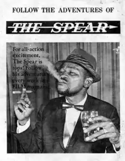 Lance Spearman (aka "The Spear") is a fictional character created in the mid-60s by Drum Publications.[2] The adventures of Lance Spearman was published in a weekly photo comic that went by the title African Film in East and West Africa and Spear Magazine in South Africa, and was featured in over one hundred and fifty issues. Lance Spearman was widely regarded as the James Bond of English speaking Africa[3] from Kenya on the East Coast to South Africa, and across the West Coast in Nigeria and Ghana. At its zenith, Lance Spearman had over half a million fans[4] across the continent until the series was discontinued in 1972.[5]