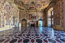 The marble floor, in white, red, and black, as well as the door frames and southern fireplace, were crafted by the Venetian artist Francesco Robba. The northern fireplace was reconstructed in 1908 by Pietro d'Aronco from Gemona. Since March 2006, the prince's stone has been placed in front of this fireplace once again.