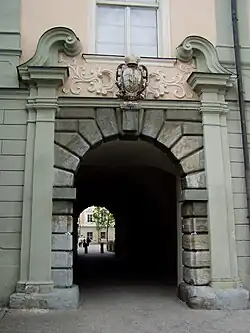 On August 16, 1723, a catastrophic fire struck Klagenfurt, inflicting severe damage on the Landhaus. In the years following this disaster, the building was extensively renovated in the late Baroque style. The south and west façades were embellished with giant pilasters and stucco-decorated window frames. The south tower was fitted with two new bells in 1724, which survived both World Wars. In 1735, Ferdinand Fromiller was commissioned to redesign the Great Hall of Arms, which continued to serve as the central venue for the Carinthian Landstände until 1848.[4] Fromiller's renovations included the installation of a marble floor with a three-color geometric pattern, the addition of a new main portal, and two fireplaces. He also painted the coats of arms of the burgraves, councilors, and other officials in the Small Hall of Arms, which was used as the council chamber for the councilors.