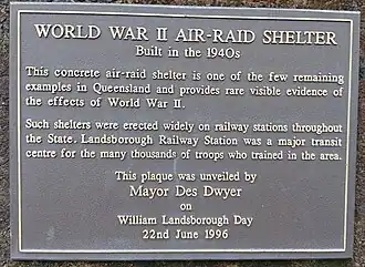 The reinforced concrete air raid shelter at the Landsborough railway station, built in 1942 by Queensland Rail, was designed to provide shelter, in the event of a Japanese air raid, for train passengers waiting at the railway station during World War II.[1]