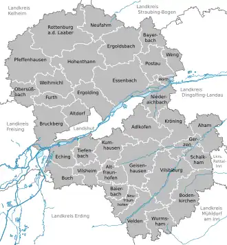 AdlkofenAhamAltdorfAltfraunhofenBaierbachBayerbach bei ErgoldsbachBodenkirchenBruckbergBuch am ErlbachEchingErgoldingErgoldsbachEssenbachFurthGeisenhausenGerzenHohenthannKröningKumhausenNeufahrnNeufraunhofenNiederaichbachObersüßbachPfeffenhausenPostauRottenburg an der LaaberSchalkhamTiefenbachVeldenVilsbiburgVilsheimWeihmichlWengWörth an der IsarWurmshamLandshutDingolfing-LandauErding (district)Freising (district)Kelheim (district)Mühldorf (district)Regensburg (district)Rottal-InnStraubing-Bogen