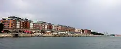 The expansion of the city and the increasing industrialization soon made it clear that the city's harbour was becoming too small and in the same time old plans to create a free port were revived. In a plan from 1862 it was decided to dig out the area to allow access for the largest ocean-going vessels and use the materials removed for land fills along the coast. A suggestion to make all of Amager into a duty-free zone was abolished and instead it was decided to create a free port in the area north of Kastellet at the site of the Langelinie promenade. The beginning of the work was prompted by Germany's construction of the Kiel Canal that was begun in 1887 and threatened Copenhagen's position.[2] In 1894 the work was completed and Copenhagen had got an entirely new harbourfront. The old beach promenade with Bourgeois mansions had turned into the heavily trafficated street Strandboullevarden located several hundred metres inland and the beach where the soldiers had been required to cool their feet had turned into harbour basins. Langelinie became now a pier on the other side of that harbour basin.