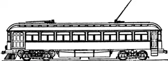 On February 3, 1902, the company completed a 18.5-mile (29.8 km) line as far as St. Johns. On entering Lansing trains joined the Cedar Street line of the local streetcar system. The electrical systems were not yet ready, so the railroad was operated by steam locomotives supplied by the Michigan Suburban Railroad. Arnold's account states that steam service began on November 15, 1901; Meints puts the completion of the line in February 1902.[2][3] Construction of the overhead lines was finished by December 1902, and tests began the following March. The first trial trips occurred on June 15, 1903, using a specially-built experimental locomotive. The company had ordered three interurban cars from the Jewett Car Company of Jewett, Ohio. These were of wooden construction, 56 feet 5 inches (17.20 m) in length, capable of seating 50 passengers, but at that stage Arnold's experimental motor lacked the motive power to drive them. A new locomotive fitted with two motors was readied for tests in early December, but a fire swept through the company's car house, destroying the locomotive, two of the Jewett cars, and a steam locomotive. While engineers constructed a new locomotive, "Phoenix," the company rebuilt the line to permit DC operation, thereby allowing Lansing streetcars to operate over it. On August 3, 1904, the new locomotive made a trial run of 8 miles (13 km) out to DeWitt. A blown circuit breaker ended the test prematurely.[4][5]
