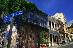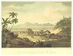 The neighborhood of Lapa in Rio de Janeiro is known as the "cradle of Bohemian Rio".[1] It is also famous for its architecture, beginning with the Arcos da Lapa (also known as the Carioca Aqueduct), which was originally constructed as an aqueduct during Colonial Brazil and now serves as a viaduct for the cable cars that climb the hill of Santa Teresa.