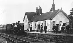 A passing loop was opened on 1 October 1873 and a wooden signal box with 13 levers built opposite the west end of the platform by the points to the loop. There was no room here for a platform to serve the new second track so it had to be built on the east side of the road bridge. This platform was unusually built in between the two lines but the back of the platform was fenced off so passengers could only board or leave westbound trains (those towards Barnstaple). The new platform was provided with a waiting shelter which incorporated a small booking office where tickets were sold for about eight minutes before trains were due to call.[3]