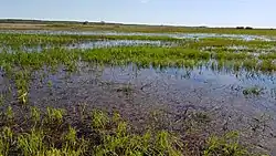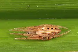 Larinia jeskovi is a species of the family of orb weaver spiders and a part of the genus Larinia. It is distributed throughout the Americas, Africa, Australia, Europe, and Asia and commonly found in wet climes such as marshes, bogs, and rainforests.[2] Larinia jeskovi have yellow bodies with stripes and range from 5.13 to 8.70 millimeters in body length.[2] They build their webs on plants with a small height above small bodies of waters or wetlands. After sunset and before sunrise are the typical times they hunt and build their web. Males usually occupy a female's web instead of making their own.[3] The mating behavior is noteworthy as male spiders often mutilate external female genitalia to reduce sperm competition while female spiders resort to sexual cannibalism to counter such mechanisms. The males also follow an elaborate courtship ritual to attract the female.[4] The bite of Larinia jeskovi is not known to be of harm to humans.