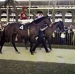 Larry Adams (June 13, 1936 – February 27, 2000) was an American jockey who was active from 1960 until 1983.[3] He rode in the Kentucky Derby five times, achieving third place riding High Echelon on May 2, 1970. His greatest successes came in 1965–1966 when he was the favored mount for a horse named Moccasin. From August 6 until November 6, 1965, Moccasin, trained by Harry Trotsek, had a streak of eight wins in a row while ridden by Adams. In 1974, at the age of 38, Adams was denied a jockey's license by the New York State Racing and Wagering Board. His license request was rejected due to his failure to mention on his license application that he had two prior arrests.[4] He was reinstated as a licensed jockey after a lengthy suspension.