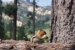 A golden-mantled ground squirrel eating foraged food near the southern entrance