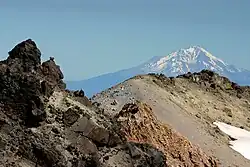 Lassen Peak is made of dacite,[20] an igneous rock, and is one of the world's largest plug dome volcanoes. It is also the southernmost non-extinct volcano of the Cascade Range (specifically, the Shasta Cascade part of the range). The 10,457 ft (3,187 m) tall volcano sits on the north-east flank of the remains of Mount Tehama, a stratovolcano that was a thousand feet (305 m) higher than Lassen and 11 to 15 mi (18 to 24 km) wide at its base.[8] After emptying its throat and partially doing the same to its magma chamber in a series of eruptions, Tehama either collapsed into itself and formed a two-mile (3.2 km) wide caldera in the late Pleistocene or was simply eroded away with the help of acidic vapors that loosened and broke the rock, which was later carried away by glaciers.