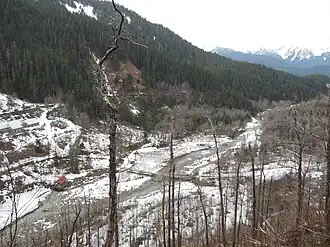 View of Gold Creek, with some of the camp buildings in the background | |