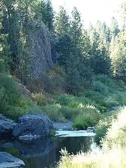 The slopes to the east are the steepest, and largely unsuitable for development except for at southernmost tip of Latah/Hangman along Hatch Road. Other than the development there, the eastern slopes are dominated by parkland covering over 500 acres commonly known as the South Hill Bluff. Trails crisscross the bluff, making switchbacks and passing through ponderosa pine forest and bunchgrass meadows.[16] The slopes to the west are less dramatic and more suitable for development. It is on those slopes that the Qulachan and Eagle Ridge developments are located.[5] The western slopes are also interrupted by valleys of smaller streams like Garden Springs Creek and Marshall Creek draining into Latah Creek.[4][11]