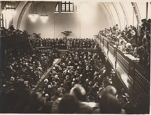 The inter-war period saw significant growth to the building itself, first with an expansion to the North block in August 1924, increasing accommodation from 150 to 355.[59] This was then followed by the construction of the Great Hall, new science laboratories, and new classrooms to the South side of the building. This was completed in November 1928, and opened by the Duke and Duchess of York (later King George VI and Queen Elizabeth).[60][61] Richard Ashworth died shortly afterwards in December 1928, having laid strong foundations.[62]