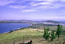 The view also shows the nearby ABC radio transmitter mast. The Ralphs Bay side of Lauderdale reveals a sharp gradient in the bay where the water changes colour. This change can be especially noticeable when driving along the main road from Hobart.