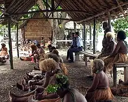 On arrival at the dock, warriors confronted the delegation until a sum of shell money was presented to the warriors as a sign of peace. Once this gift was received the village girls offered the delegation refreshments.