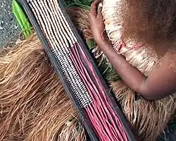 What makes this money valuable are the purple disks, whose number per string is carefully calculated and which are made from the lips of the Romu shell which the Langa Langa people collect twice a year from the lagoon areas of the clan of the Lau tribe. The chief of the Lau clan allows them to fish for the shells in exchange for half the money strings.[20]