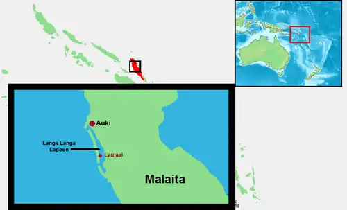 Laulasi island is an artificial island in the Langa Langa Lagoon, South of Auki on the island of Malaita in Solomon Islands. It is believed that hostilities among the inlanders of Malaita forced some people into the lagoon where over time they built their islands on sandbars after diving for coral. The religion of the island was based on prayers and offerings to the ghosts of dead ancestors, mediated by priests who kept their skulls and relics in tabu houses. Some ancestors were incarnated as sharks which protected their descendants. Langalanga is also the main source of the shell money now made in Solomon Islands.