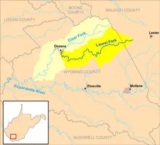 ![]() The Laurel Fork and its watershed, highlighted within the larger Clear Fork watershed, in Wyoming and Raleigh counties, West Virginia. | |