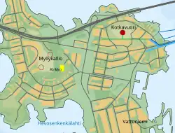 In summer 1956 the waterworks suggested Kotkavuori as the new location for the water tower. The proposal said that the effect the Lauttasaari church had on the zoning plan was that Kotkavuori was an equal option for the location as Myllykallio, as both had the same height of 27 metres from sea level in the spots reserved for the water tower. However, had the tower been located in Myllykallio, it would have cost 20 million markka more, as the location was further away from Salmisaari than Kotkavuori.[3]: 3