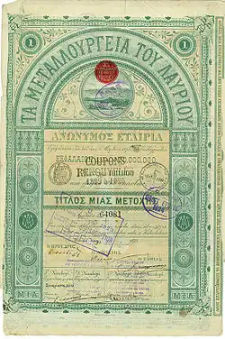 - ^ a b "Η μεγαλύτερη φούσκα όλων των εποχών. Τα λαυρεωτικά, όταν οι Έλληνες πούλαγαν τα χωράφια τους για να αγοράσουν μετοχές, ενώ δεν υπήρχε καν χρηματιστήριο. Έχασαν όλοι εκτός από τον Συγγρό". ΜΗΧΑΝΗ ΤΟΥ ΧΡΟΝΟΥ (in Greek). 2019-10-01. Retrieved 2023-01-14.