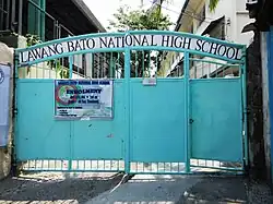 Lawang Bato National High School is a high school in the Philippines. It is located in Centro St., Lawang Bato, Valenzuela City. and known as the first of having a solar powered library in Metro Manila