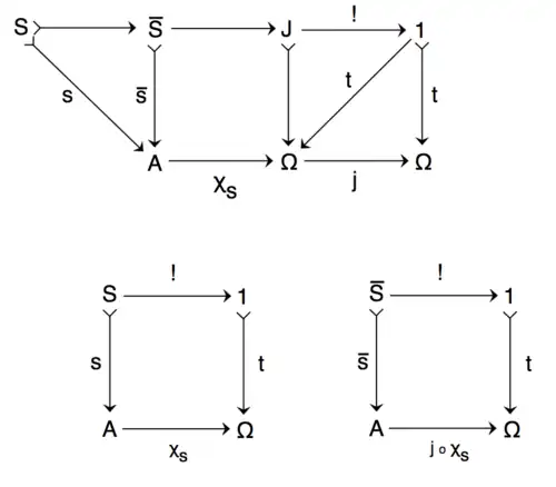 Commutative diagrams showing how j-closure operates. Ω and t are the subobject classifier. χs is the characteristic morphism of s as a subobject of A and is the characteristic morphism of which is the j-closure of s. The bottom two squares are pullback squares and they are contained in the top diagram as well: the first one as a trapezoid and the second one as a two-square rectangle.