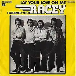 "Lay Your Love on Me" is a song by the British pop band Racey. The song was written by Nicky Chinn and Mike Chapman, produced by Mickie Most and released in 1978 on the RAK label as their second single. It was their first hit single, reaching No. 3 on the UK Singles Chart[1] and No. 2 in Ireland in December 1978. It was also a No. 1 hit in the Netherlands, Australia and New Zealand later that same year.