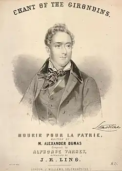 "Le Chant des Girondins" ('The Chant of the Girondins') was the national anthem of the French Second Republic, written for the drama Le Chevalier de Maison-Rouge by the writer Alexandre Dumas with Auguste Maquet. The lines of the refrain were borrowed from "Roland à Roncevaux", a song written in Strasbourg by Claude-Joseph Rouget de Lisle, the author of "La Marseillaise".[1] The music is by conductor-composer Alphonse Varney.[2]
