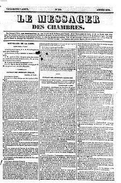 Le Messager des Chambres was a French newspaper whose founder was the vicount de Martignac, ultra-royalist who fought against the laws of censorship in France under the July Monarchy.