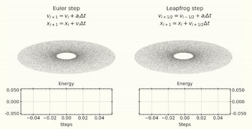 Leapfrog integration is a second-order method, in contrast to Euler integration, which is only first-order, yet requires the same number of function evaluations per step. Unlike Euler integration, it is stable for oscillatory motion, as long as the time-step is constant, and .[1]