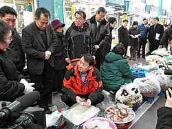 The Grand National Party (GNP) presidential candidate Lee Myung-bak was elected the new president in 2007 amid the low popularity of the Roh government.[15] Lee Kwang-jae, however, was re-elected to his constituency at the 2008 election.[16] Nevertheless, on 26 March 2009, he was detained over the allegations of receiving 160,000,000 won (£100,940) from Park Yeon-cha and Jung Dae-geun.[7][17][18] He announced his resignation as an MP, as well as retirement from politics.[7][17][18] The Democratic Party dissuaded him to retract the decision.[19]