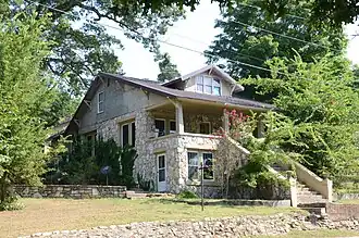 The Lee Weaver House is a historic house at the northwest corner of Main and Cope Streets in Hardy, Arkansas. Built 1924–26, this 1+1⁄2-story stone structure is a fine local example of the Bungalow style. It is fashioned out of native rough-cut stone, joined with beveled mortar. It has a side gable roof with a shallow pitch, and extended eaves with exposed rafter ends and knee braces. A wide gable-roof dormer with three sash windows pierces the front slope. The roof shelters a front porch supported by tapered square columns.[2]