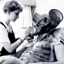 With the exception of Cruise and Sara, all the principal actors spent hours every morning having extensive makeup applied.[17] Between 8 and 12 prosthetic pieces were applied individually to each face, then made up, molded and grafted into the actor's face so that the prosthetics moved with their muscles.[22] Each person needed three makeup artists working on them for an average time of three and a half hours spent applying prosthetics. Actor Tim Curry took five and a half hours because his entire body was encased in makeup,[17] the film's most challenging character design.[23] His makeup as Darkness is considered to be one of the most iconic images in all of fantasy cinema.[24][25]