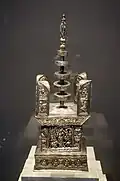The former was placed in the earthly palace and contained a gold vessel wrapped in a thin gold sheet in the form of a coffin, the details of which are unknown as it was not opened, and was believed to contain the relics of the Buddha's bun hair; the latter is thought to have been placed in the heavenly palace and a gourd-shaped gold vase, which also contained the relics, was suspended inside the tower.[11][28]
