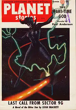 Brackett's novella "Last Call from Sector 9G" was the cover story in the final issue of Planet Stories in 1955, illustrated by Kelly Freas.