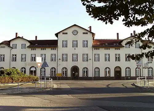 Belgershain station was originally opened as a halt, but was reclassified as a station on 1 May 1905. Since numerous surrounding localities used the station, the station had to be expanded by 1900. A loading road, a freight shed and a side ramp were available for freight transport. The two-storey[23] entrance building housed baggage handling and the ticket office as well as the main signal box "Bn". Guard signal box "Bw" and a railway residence were also built. In the 1930s, the town, which had only about 700 inhabitants, was served by long-distance services with several express trains passing through the station, which had three mainline tracks.[24] The third mainline track was dismantled after the end of the war.