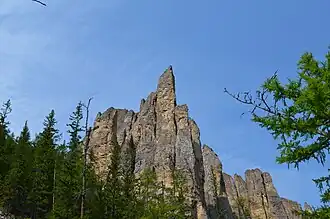 The Lena Pillars (Russian: Ле́нские столбы́, romanizedLenskiye Stolby; Yakut: Өлүөнэ туруук хайалара, Ölüöne Turūk Khayalara) are a natural rock formation along the banks of the Lena River in far eastern Siberia. The pillars are 150–300 metres (490–980 ft) high, and were formed in some of the Cambrian period sea-basins. The highest density of pillars is reached between the villages of Petrovskoye and Tit-Ary. The Lena Pillars Nature Park was inscribed on the World Heritage List in 2012.[1]