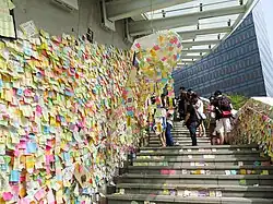 Lennon Wall (Chinese: 連儂牆; Jyutping: lin4 nung4 coeng4), in the Hong Kong context, originally referred to the mosaic wall created during the Umbrella Movement,[1] located at Central Government Complex, Harcourt Road, Admiralty. The wall is one of the major artworks of the Umbrella Movement as a collective artistic work of spontaneous free expression, demanding democracy in the elections of the territory's top leaders.