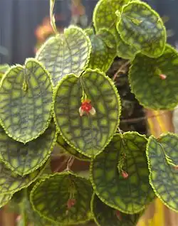 Lepanthes calodictyon is a small epiphytic orchid native to the montane forest of Ecuador and Colombia, commonly found at elevations ranging from 450 to 1,500 metres (1,480 to 4,920 ft).[1][2] This orchid practices pseudocopulation, with the flower resembling a female insect to the extent of initially fooling entomologists) the flower grows out of the leaf. The leaves have a checkerboard pattern of two shades of green on the upper surface, and red stripes on white underneath.[3]