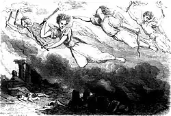 The thirty-fourth poem of Les Orientales is "Mazeppa". This poem, written in May 1828,[1] deals with the legendary story of Ivan Mazepa who was punished because he was caught in a love affair with a Polish nobleman's wife. The poem is organized in two parts: the first one is about Mazeppa's physical travel across the plains of Russia, strapped naked on the horse's back, until its death. The second part is about his spiritual travel to get back to life, and has been described as a kind of allegory of the creative process: "He races, he flies, he falls. He rises again, king".[2] The poem cites Lord Byron (author of the narrative poem Mazeppa) and is dedicated to Louis Boulanger, who painted Byron's version. All the works ultimately derive from the cultural legacy of Mazeppa.