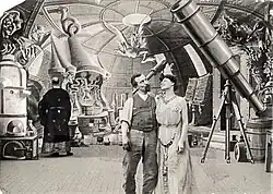 Behind the scenes of the film: Méliès, in costume, attends to the scenery while a crew member and actor make faces for the camera