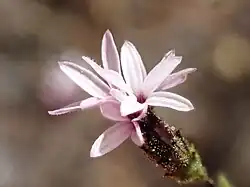 This is a slender annual herb growing erect and varying in size from just a few centimeters to over half a meter tall, with spreading branches. It is often hairy or woolly in texture. The upper leaves are small and pointed, no more than 2 centimeters long, and the lower leaves are longer and wither early. The petite flower heads appear singly or in clusters. Each head is lined with purple-tipped, glandular phyllaries. The head is discoid, containing no ray florets but a few funnel-shaped, lobed disc florets in shades of light purple to nearly white. The fruit is an achene with pappus of five distinct whitish points.