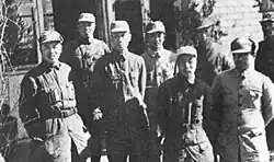 In 1942, Liu Shaoqi came to Shandong to inspect the work. From left: Li Yu, Zhou Changsheng, Liu Shaoqi, Chen Guang, Xiao Hua, Liang Xingchu, Luo Ronghuan.