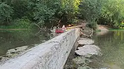 Liberty Mills was home to a crib dam on the Eel River, located directly south of the existing iron bridge on 1st Street. It was originally built in the nineteenth century to power one of the many mills. By the early twentieth-first century it had been out of operation for numerous years and damaged on the far north end. With a $120,000 grant from the Ohio River Basin Fish Habitat Partnership program and the U.S. Fish & Wildlife Service the dam was destroyed October 11–12, 2012.[13] The dam was destroyed to improve fish passages and raise the long-term health of the Wabash River watershed.[14]