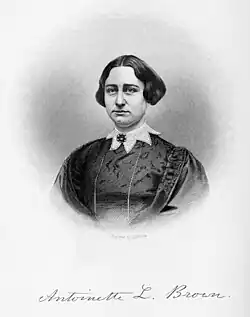 Women were indispensable participants in the Liberty Party; their involvement in Liberty campaigns and conventions mirrored their importance to the larger abolitionist movement. While the Cult of Domesticity consigned formal politics to the male sphere, women's role as guardians of morality in their homes and communities allowed them to enter Liberty meetings and speak on behalf of Liberty candidates in their public activism. Most Liberty members considered the party a moral crusade against slavery; an interest in Liberty activities thus appeared a natural extension of the female sphere. Women were frequently present for Liberty conventions and sometimes served as voting delegates. In the Old Northwest, with its tradition of women's political involvement, female abolitionists were prominent movers and drivers of the Liberty Party.[90] The Henry County Female Anti-Slavery Society was the foremost Liberty mouthpiece in Indiana; the preamble and resolutions adopted by the society at its 1841 meeting expressly affirmed "that it is our duty to endeavor by all reasonable means to persuade our fathers, husbands and brothers to make use of their elective franchise to place men in office who will remove these evils [slavery and racial prejudice] by the introduction of righteous and just laws into the civil code of our country."[91] Michigan Liberty women raised funds to support Liberty Party activities. The Illinois Female Anti-Slavery Society coordinated with the state Liberty Party, and female editorialists like Mary Brown Davis promoted the congressional candidacy of Owen Lovejoy.[92] As the decade progressed, male abolitionists increasingly sought women's involvement in Liberty organizations and conventions. Abby Kelley attended the 1843 National Liberty Convention despite her Garrisonian leanings and made an impassioned address to the delegates, becoming the first woman to address the national convention of an American political party. Elizabeth Cady Stanton became involved in Liberty activism through her husband, Henry B. Stanton, and first cousin, Gerrit Smith. Antoinette Brown was a prominent female Anti-Garrisonian who took an active role in the New York Liberty Party and worked on Smith's 1852 congressional campaign. Lydia Child and Lucretia Mott each received one vote for president at the 1847 convention of the Liberty League, and Mott received five votes for vice president at the 1848 rump convention that nominated Smith and Foote.[93]