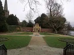 In wider context in the Garden of Remembrance in 2012. Minster Pool at right and Lichfield Cathedral in background