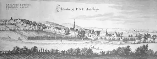 Merian copperplate around 1650 of the village of Lichtenberg. Left: the ruins on the hill